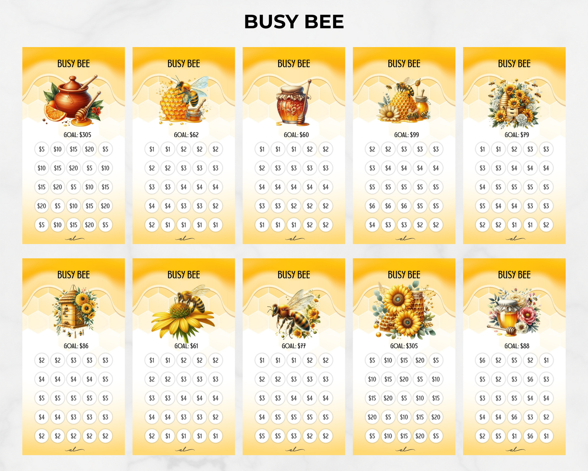 This pack features low-denomination challenges like Busy Bee and Pocket Change, along with similar small-step savings cards that focus on progress over perfection. With manageable amounts and encouraging visuals, this bundle makes it easier to build the habit of saving without stress or pressure.